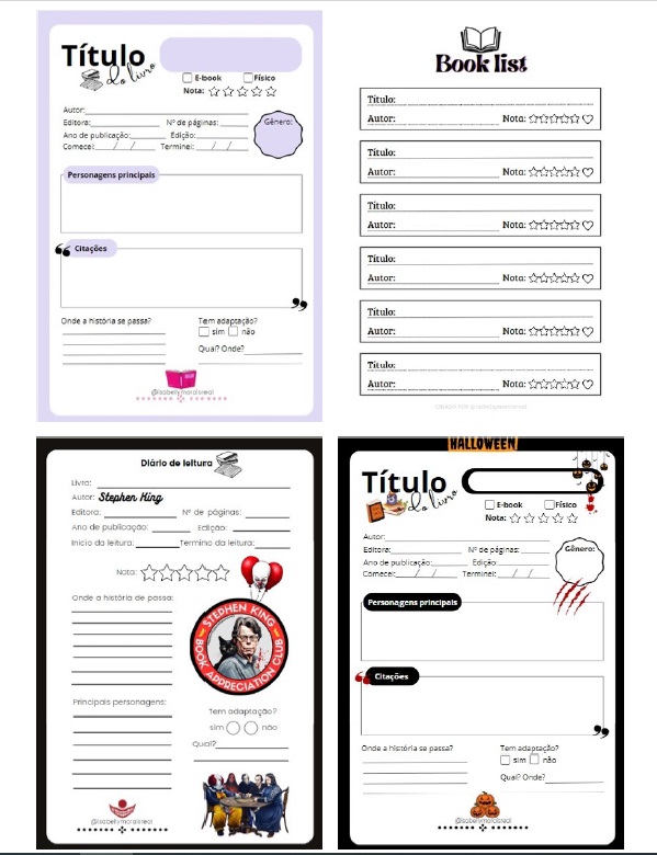 Com o Diário de Leitura (4 modelos inclusos), planeje, registre e evolua na sua jornada literária. Escolha entre 3 cores e 4 tipos de diários de leitura diferentes. Receba 7 páginas temáticas, 9 marcadores de páginas de brinde e uma lista de livros em ordem cronológica. Adquira o diário por menos de 12 reais e apoie a produção de conteúdo nas redes sociais. Entre em contato para receber o arquivo em PNG por e-mail.